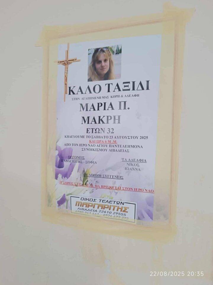 Η εξόδιος ακολουθία θα τελεστεί το Σάββατο 23 Αυγούστου στον Ι.Ν. Αγίου Παντελεήμονα στον Συνοικισμό Λιβαδειάς και ώρα 18.00.