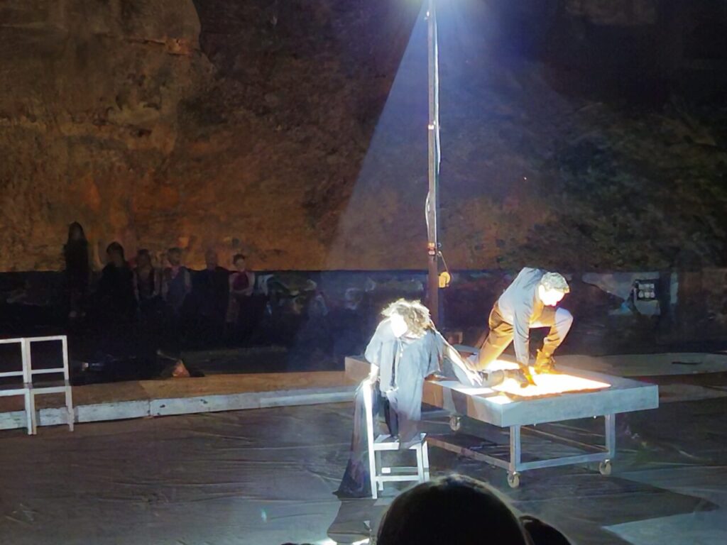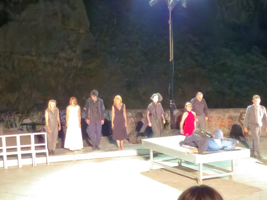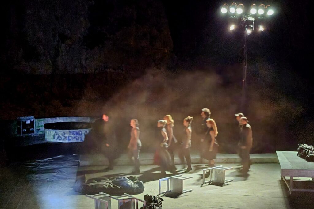 Ο σκηνοθέτης Θέμης Μουμουλίδης, επανερχόμενος στην αρχετυπική αυτή τραγωδία, υιοθετεί μια τολμηρή σύλληψη: μεταφέρει τη δράση σε μεταπολεμικό νεκροτομείο, με τους νεκρούς στοιβαγμένους σε σάκους, εγκαθιδρύοντας εξαρχής μια ατμόσφαιρα βαριάς υπαρξιακής φόρτισης. Η σκηνική αυτή μετατόπιση δεν είναι αισθητικός καλλωπισμός. Είναι οντολογικό σχόλιο, ένα σκηνικό πεδίο μετα-αποκάλυψης όπου το ανθρώπινο υποκείμενο έρχεται αντιμέτωπο με το ίδιο του το είναι-προς-θάνατον.