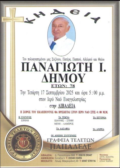 Η εξόδιος ακολουθία θα τελεστεί σήμερα, Τρίτη 17 Σεπτεμβρίου, στις 5:00 μ.μ., στον Ιερό Ναό Ευαγγελιστρίας στη Λιβαδειά, όπου συγγενείς, φίλοι και συμπολίτες θα του απευθύνουν το τελευταίο αντίο.