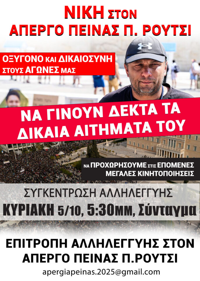Συγκέντρωση αλληλεγγύης διοργανώνεται την Κυριακή 5 Οκτωβρίου στις 5:30 μ.μ. στην πλατεία Συντάγματος υπέρ του Π. Ρούτση, ο οποίος βρίσκεται σε απεργία πείνας διεκδικώντας την ικανοποίηση του αιτημάτος εκταφής της σορού του γιου του.
