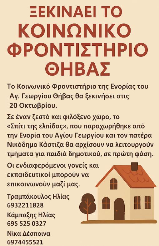 Το Κοινωνικό Φροντιστήριο της Ενορίας Αγίου Γεωργίου Θήβας ανοίγει και φέτος τις πόρτες του προσφέροντας δωρεάνΔιαβάστε