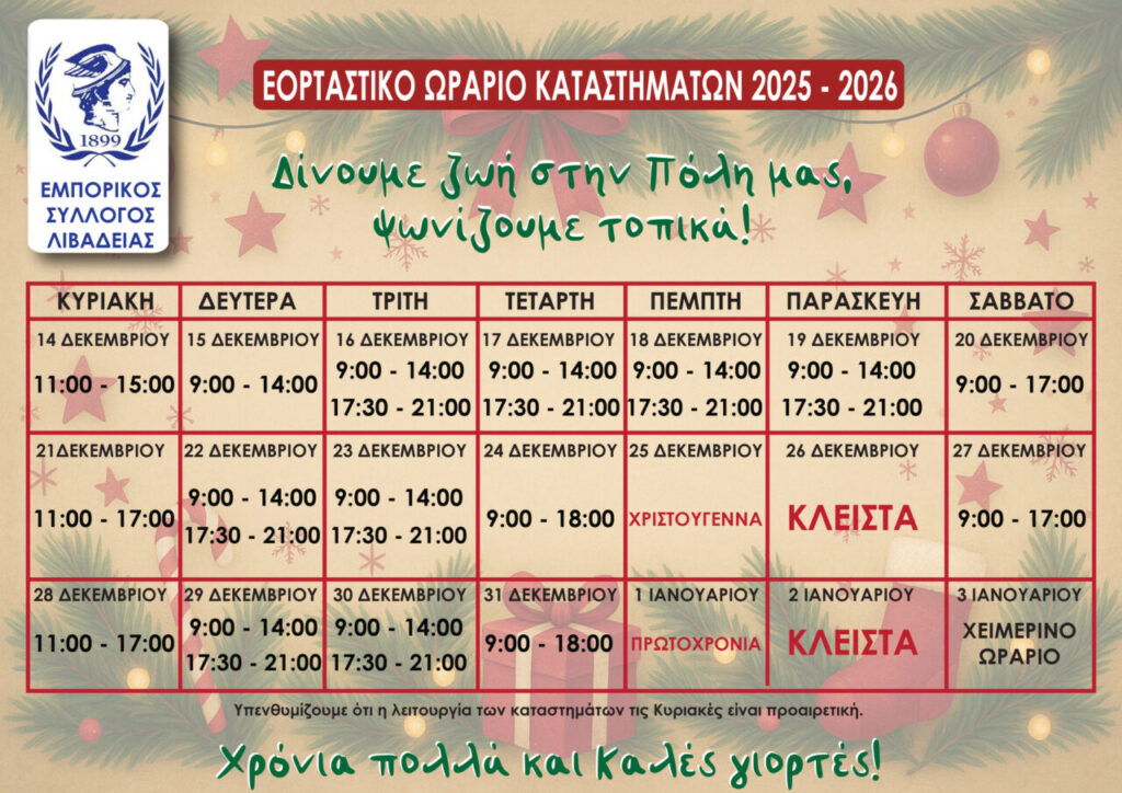 Ο Εμπορικός Σύλλογος Λιβαδειάς ανακοίνωσε το εορταστικό ωράριο των καταστημάτων για την περίοδο 2025–2026. Το πρόγραμμα ξεκινά στις 14 Δεκεμβρίου και περιλαμβάνει παρατεταμένο ωράριο, βραδινές αγορές και λειτουργία τριών Κυριακών.