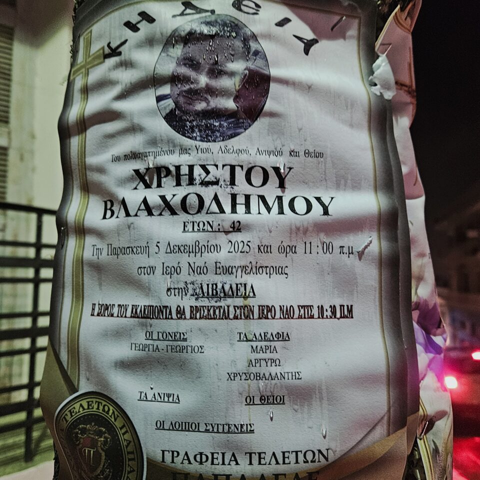 Η κηδεία του θα γίνει αύριο Παρασκευή 5 Δεκεμβρίου 2025 και ώρα 11.00 πμ. στον Ι Ν. Ευαγγελιστρίας Λιβαδειάς.