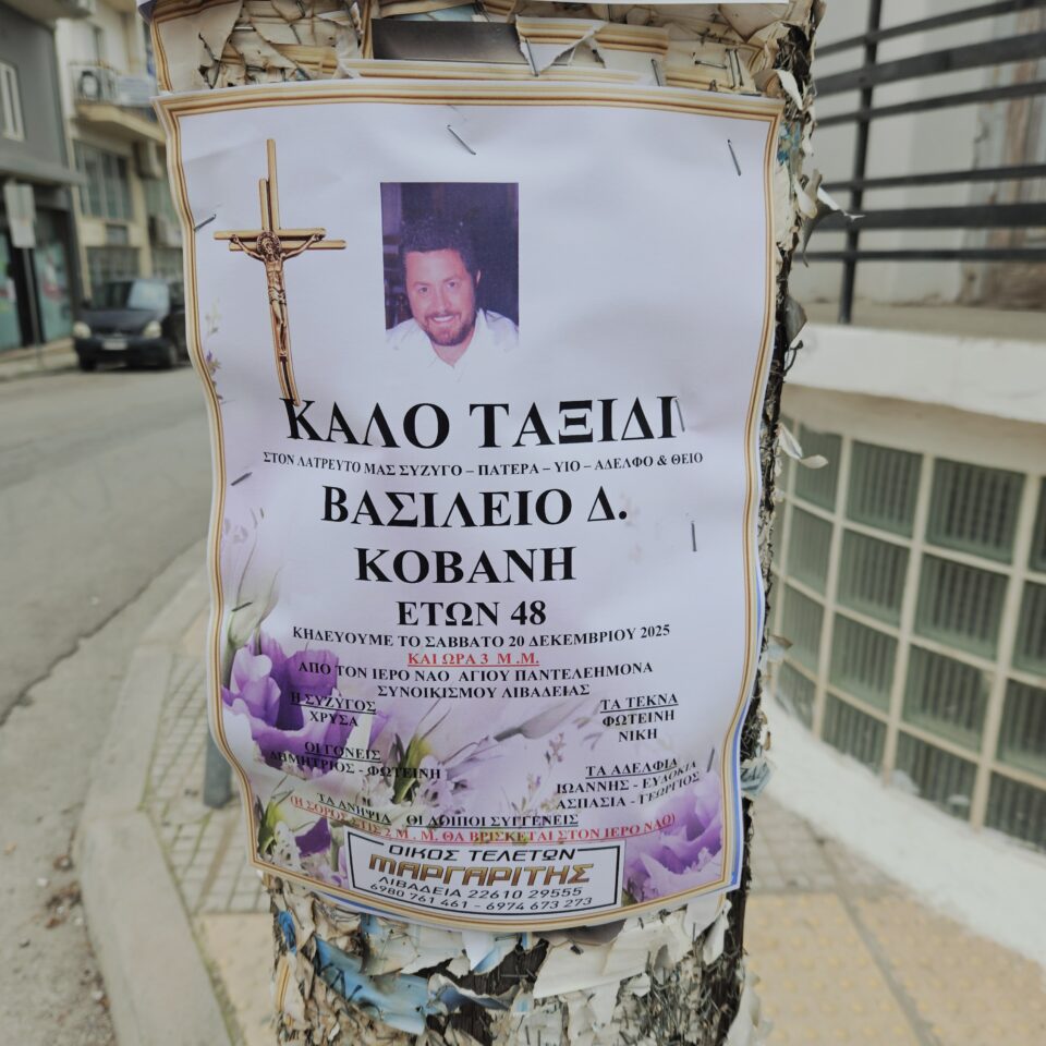 Στις 3.00 το μεσημέρι του Σαββάτου γίνεται η κηδεία του Βασίλη Κοβάνη που τόσο ξαφνικά έφυγε από τη ζωή σε ηλικία 48 ετών. Η κηδεία τελείται στον Ι. Ν. Αγίου Παντελεήμονα Συνοικισμού.