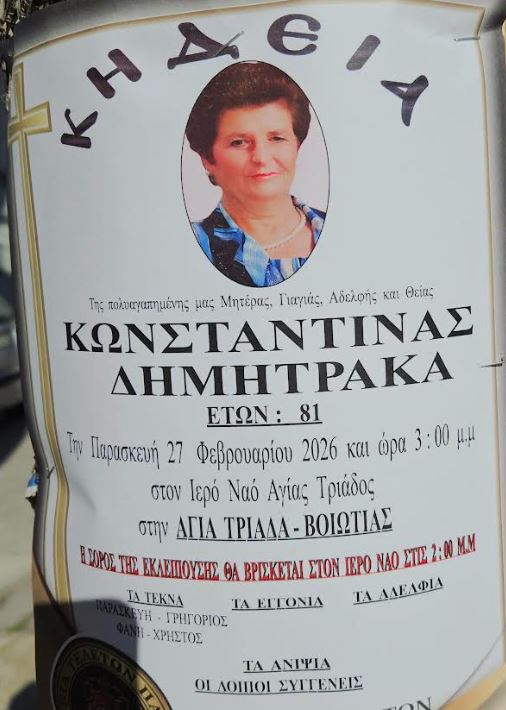 Τελέστηκε την Παρασκευή 27 Φεβρουαρίου 2026, στις 15.00, στον Ιερό Ναό Αγίας Τριάδος στην Αγία Τριάδα Βοιωτίας η εξόδιος ακολουθία της Κωνσταντίνας Δημητράκα, η οποία έφυγε από τη ζωή σε ηλικία 81 ετών.