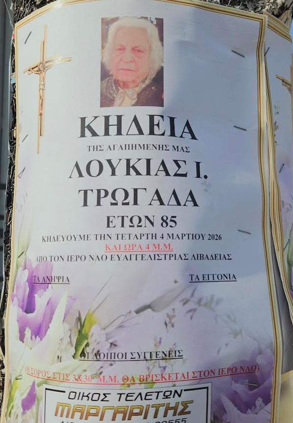 Εφυγε από τη ζωή σε ηλικία 85 ετών η Λουκίας Ι. Τρωγάδα, αγαπημένη μητέρα και γιαγιά. Η κηδεία τελέστηκε χθες 4 Μαρτίου 2026 στον Ιερό Ναό Ευαγγελίστριας Λιβαδειάς. On 5 Μαρτίου 2026