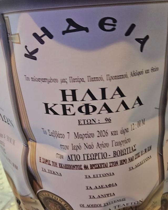 Ο Ηλίας Κεφαλάς, πλήρης ημερών και σε ηλικία 96 ετών, έφυγε από τη ζωή, αφήνοντας πίσω του οικογένεια, φίλους και όσους τον γνώρισαν. Η εξόδιος ακολουθία τελέστηκε το Σάββατο 7 Μαρτίου 2026 στον Ιερό Ναό Αγίου Γεωργίου στον Αγιο Γε’ωργιο Βοιωτίας.