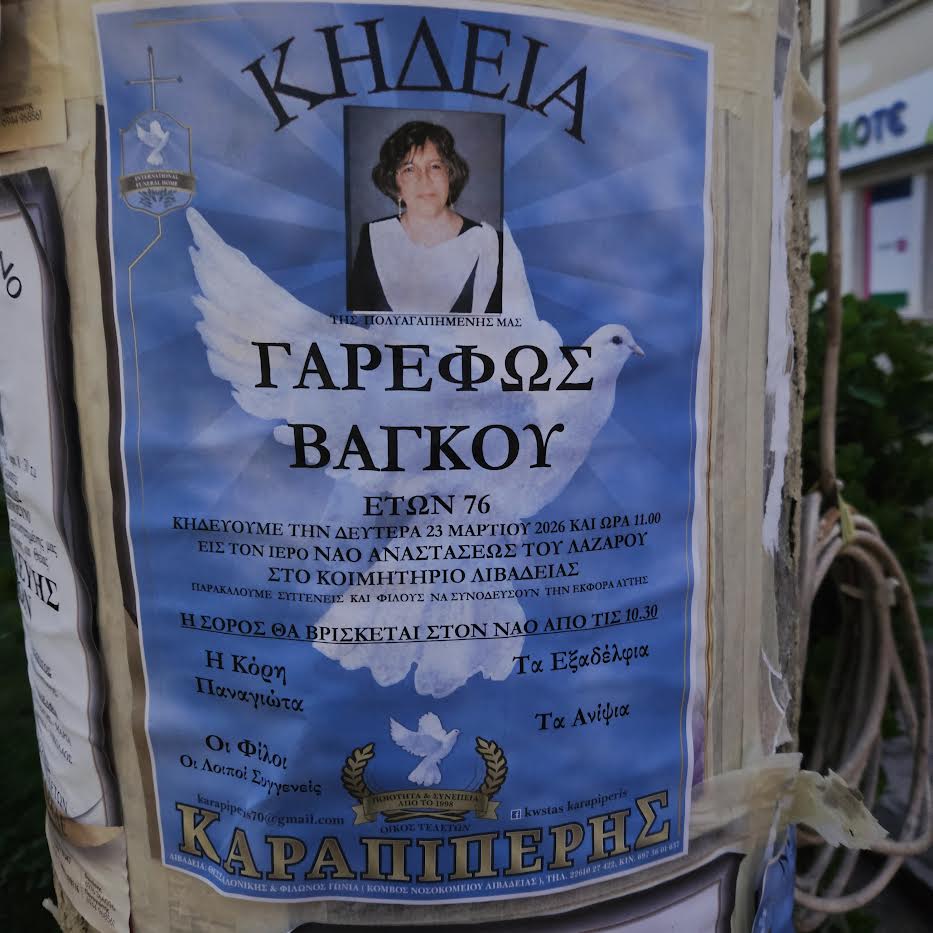 Η κηδεία της τελείται σήμερα Δευτέρα 23 Μαρτίου 2026 και ώρα 11:00, στον Ιερό Ναό Αναστάσεως του Λαζάρου, στο Κοιμητήριο Λιβαδειάς.