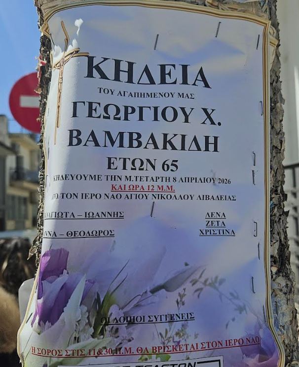 Η κηδεία του Γεωργίου Χ. Βαμβακίδη πραγματοποιήθηκε σήμερα, Τετάρτη 8 Απριλίου 2026, στον Ιερό Ναό Αγίου Νικολάου Λιβαδειάς, παρουσία συγγενών και φίλων.
