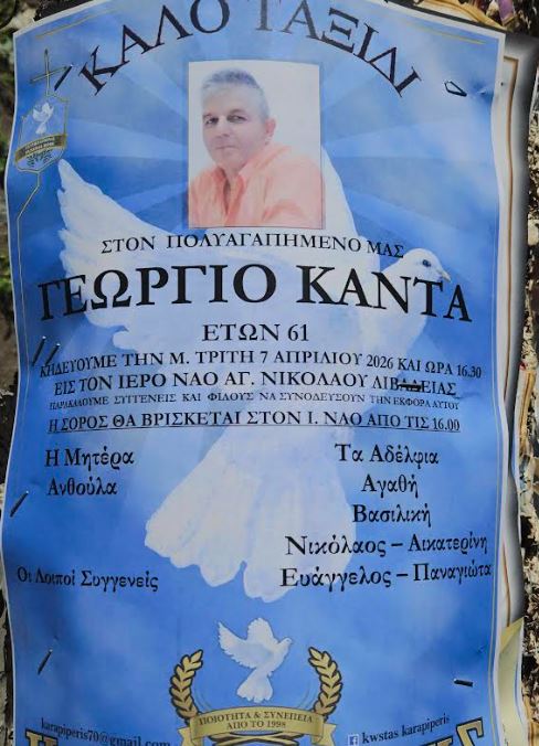 Με βαθιά θλίψη και σε κλίμα συγκίνησης, συγγενείς, φίλοι και η τοπική κοινωνία της Λιβαδειάς αποχαιρέτησαν την Μεγάλη Τρίτη, 7 Απριλίου 2026, τον Γεώργιο Καντά, ο οποίος έφυγε από τη ζωή σε ηλικία 61 ετών.