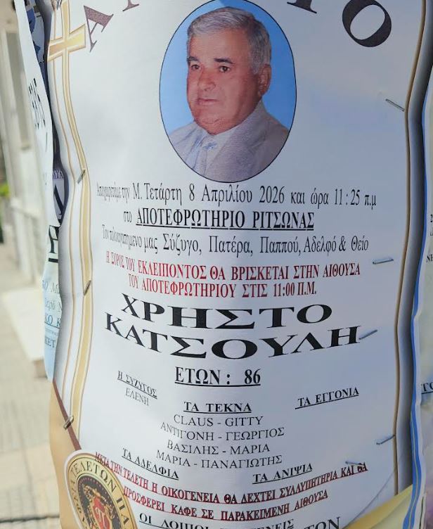 Η τελετή αποχαιρετισμού του Χρήστου Κατσούλη πραγματοποιήθηκαν χθες, Μεγάλη Τετάρτη 8 Απριλίου 2026, στο Αποτεφρωτήριο Ριτσώνας, παρουσία συγγενών και φίλων.