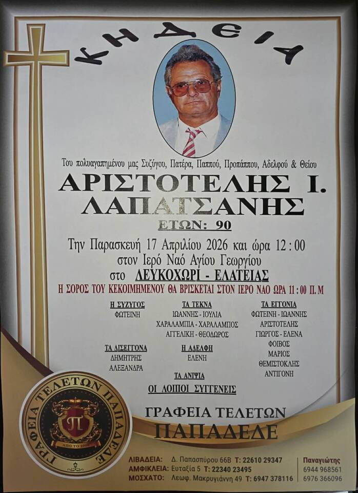Ο Αριστοτέλης Ι. Λαπατσάνης απεβίωσε σε ηλικία 90 ετών. Υπήρξε σύζυγος της Φωτεινής, αγρότης και άφησε μια πολυμελή οικογένεια που θα τον θυμάτια με αγάπη. Η εξόδιος ακολουθία θα τελεστεί την Παρασκευή 17 Απριλίου 2026, στις 12:00, στον Ιερό Ναό Αγίου Γεωργίου στο Λευκοχώρι Ελάτειας. Η σορός θα βρίσκεται στον ναό από τις 11:00.