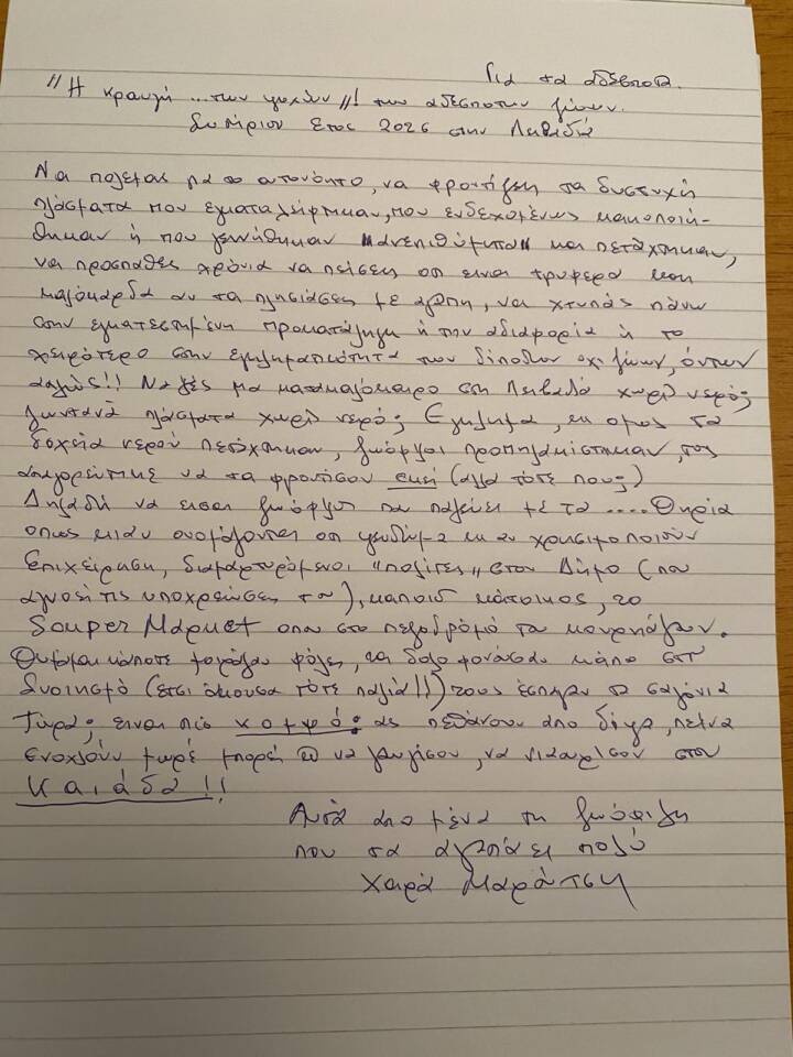 Σε μια εποχή που ο πολιτισμός μιας κοινωνίας κρίνεται από τον τρόπο που συμπεριφέρεται στους πιο αδύναμους, η επιστολή της Χαράς Μαρούτση έρχεται να ταράξει τα λιμνάζοντα νερά. Δεν πρόκειται για μια καταγγελία αλλά για ένα «κατηγορώ» γεμάτο πόνο και αλήθεια, γραμμένο από έναν άνθρωπο που βιώνει καθημερινά την εγκατάλειψη, την κακοποίηση και, το χειρότερο όλων, την παγερή αδιαφορία.