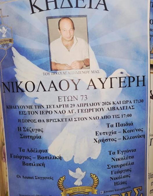 Βαρύ πένθος στην κοινωνία της Λιβαδειάς για τον Νικόλαο Αυγέρη, ο οποίος απεβίωσε σε ηλικία 73 ετών.Η εξόδιος ακολουθία θα ψαλεί την Τετάρτη 29 Απριλίου 2026 στις 17:30, στον Ιερό Ναό Αγίου Γεωργίου Λιβαδειάς, ενώ η σορός θα βρίσκεται στον ναό από τις 17:00.