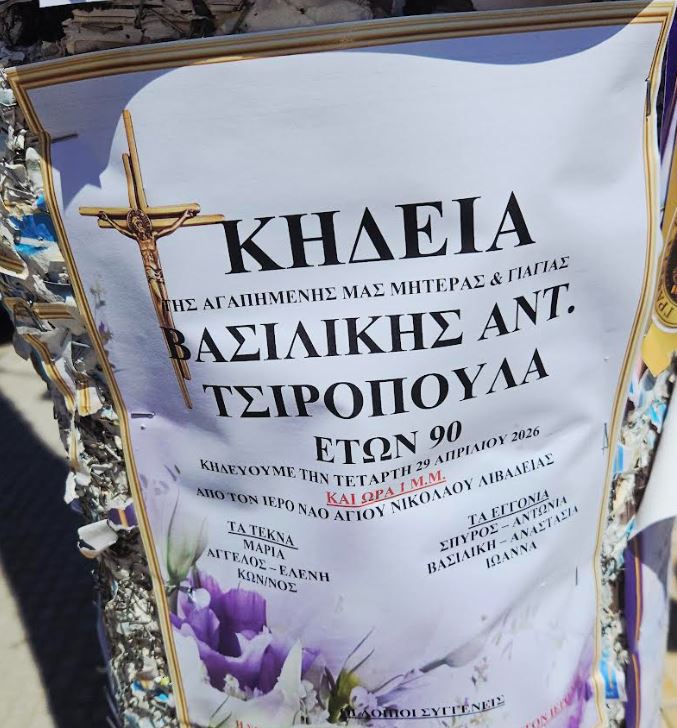 Εφυγε από τη ζωή η Βασιλική Αντ. Τσιροπούλα σε ηλικία 90 ετών. Η κηδεία της τελέστηκε σήμερα Τετάρτη 29 Απριλίου 2026 και ώρα 13:00, από τον Ιερό Ναό Αγίου Νικολάου Ζαγαρά, όπου συγγενείς και φίλοι της απηύθυναν το τελευταίο «αντίο».